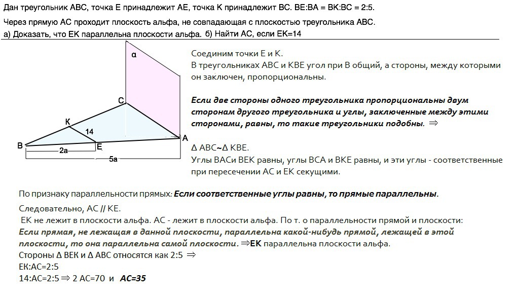 Дан треугольник АВС, точка Е принадлежит АЕ, К принадлежит ВС. ВЕ:ВА т.к ВК:ВС т.к 2:5. Через прямую АС проходит плоскость альфа, не совпадающая с плоскостью треугольника АВС.