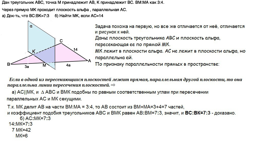 Дан треугольник АВС, точка М принадлежит АВ, К принадлежит ВС. ВМ:МА как 3:4. Через прямую МК проходит плоскость альфа , параллельная АС.