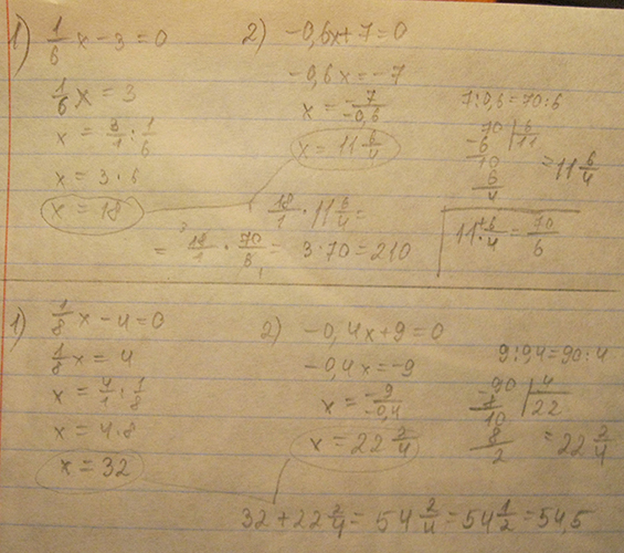 Решите уравнения 1/6х-3=0 и -0,6 х +7=0 и найдите произведения их корней.
