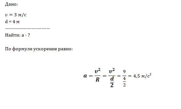 Скорость вращения крайних точек платформы карусельного станка 3 м/с. Найдите ускорение платформы карусельного станка, если его диаметр 4 м.