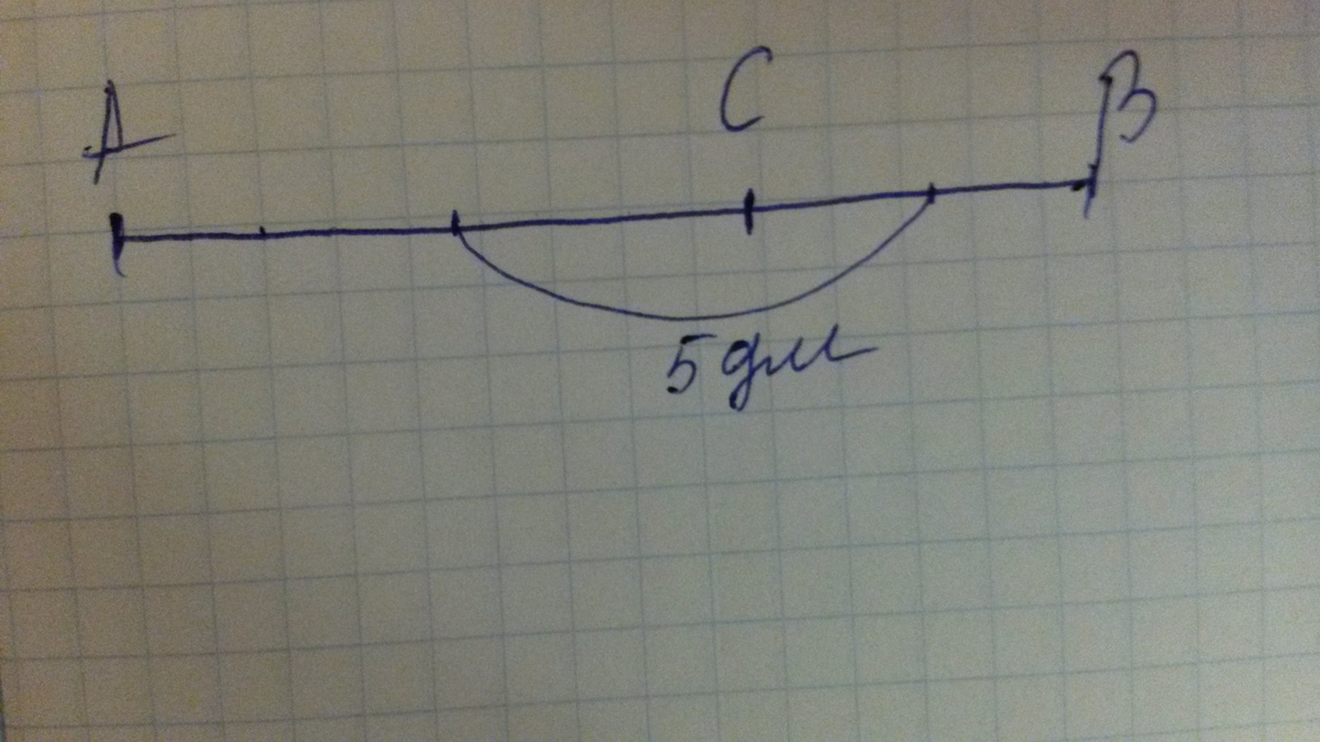 Например: некоторая точка - точка С. АВ=АС+ВС 1/2АС+1/2СВ=5 дм. Оставшуюся часть также можно записать: 1/2АС+1/2 СВ, значит она тоже равна 5 дм. Поэтому АВ=5+5=10 дм