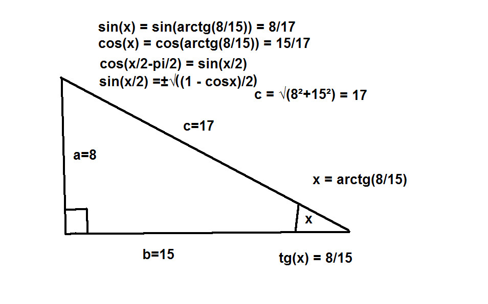 sin(x/2) = sin(0.5arctg(8/15)) = cos(0.5arctg(8/15)-0.5pi) =1/√17 = √17/17