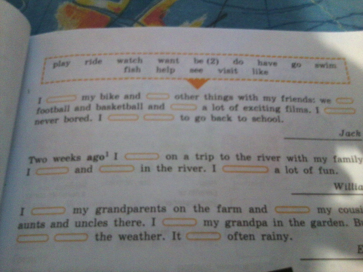 I rode my bike and did other things with my friends:we played football and basketball and watched a lot of exciting films.I was never bored.I didn't want to go back to school. Two weeks ago I went on a trip to the river with my family.I fished and swam in the river.I had a lot of fun.I visited my grandpatents on the farm and saw my cousin,aunts and uncles there.I helped my grandpa in the garden.But(там какое то слово,там не видно,но скорее всего там I ,как я поняла?)didn't like the weather.I was often rainy