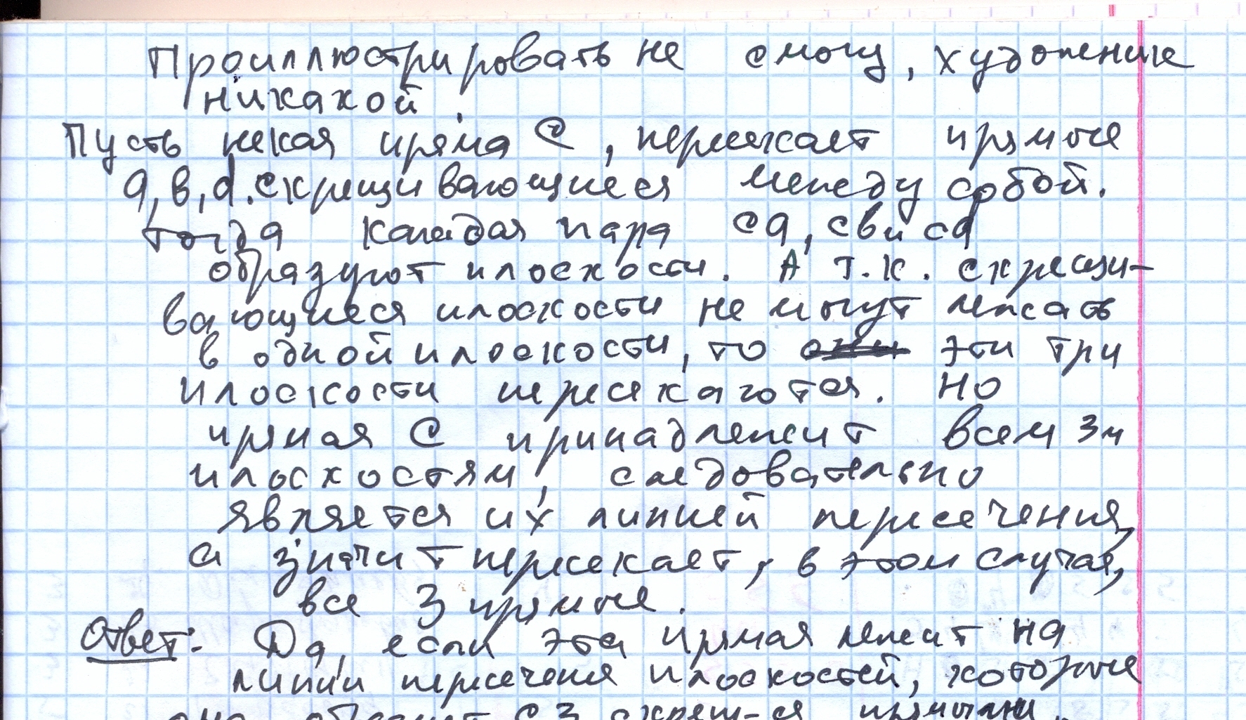 2)Можно ли провести прямую, пересекающую каждую из трех скрещивающихся прямых?ответ пояснить и проиллюстрировать мб