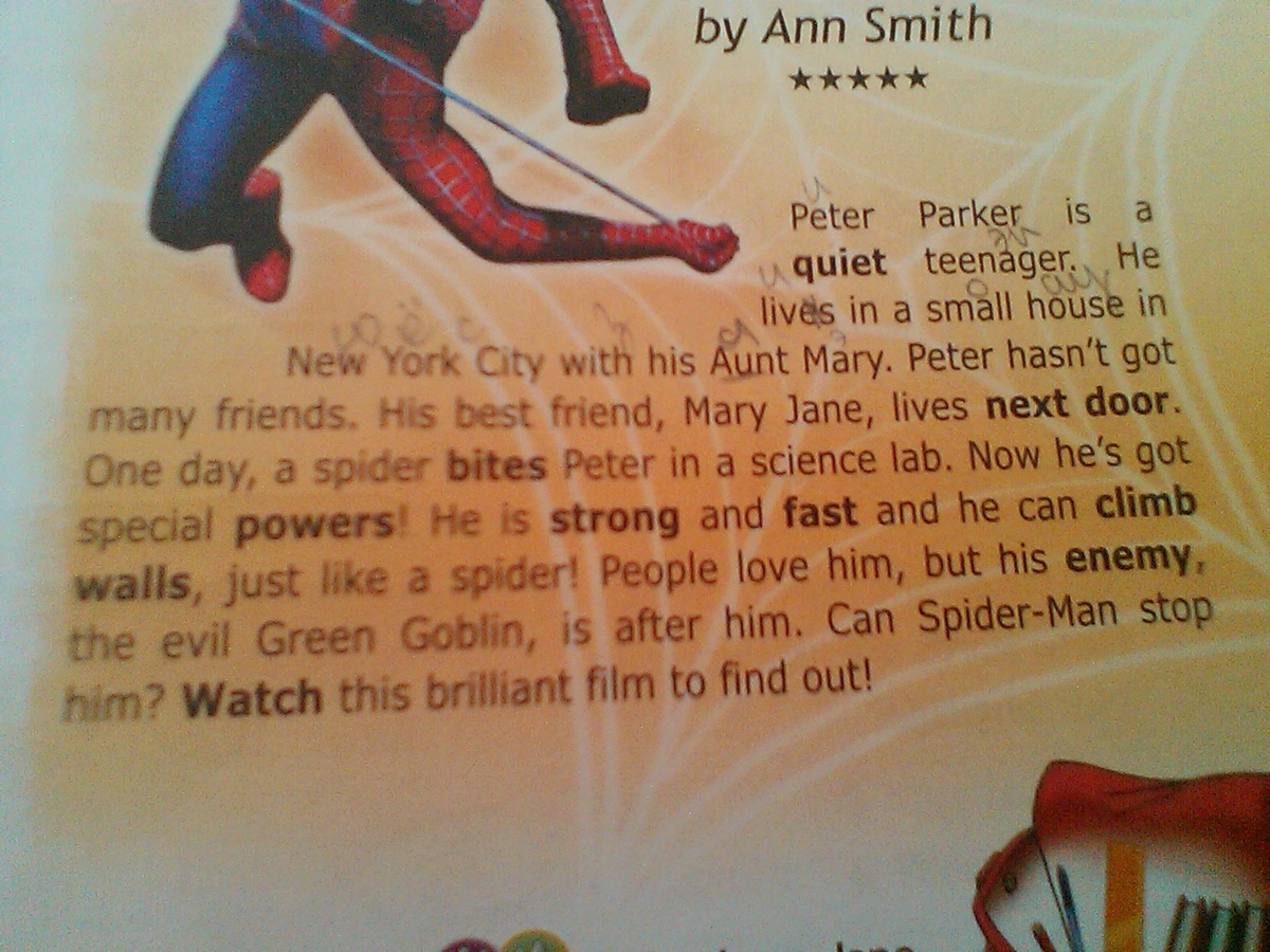 Питер Паркер - тихий подросток. Он живёт в маленьком доме в Нью-Йорке с его Тётей Мэри. У Питера не так много друзей. Его лучший друг, Мэри Джейн, живёт по соседству. Однажды паук укусил Питера в научной лаборатории. Теперь у него есть супер силы. Он сильный, быстрый и теперь может карабкаться по стенам как паук! Люди любят его, но его враг, злой Зелёный Гоблин, после него (скорее всего он следит за ним). Может ли Человек-Паук остановить его? Посмотрите этот изумительный фильм, чтобы найти ответ!