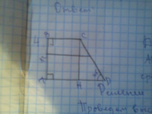 в прямоугольной трапеции меньшая боковая сторона равна 12см, а большая составляет с большим основанием угол 45 градусов. Найдите основание трапеции, если