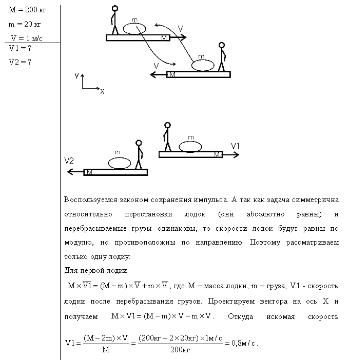 две лодки движутся на встречу друг другу по инерции параллельными курсами с одинаковыми скоростями 1 м/с. из первой лодки общей массой 200 кг сначала выбрасывается перпендикулярно движению груз массой 20 кг, а затем из встречной лодки в нее тоже перпендикулярно движению перебрасывается груз такой же массы. определить скорость первой лодки после перебрасывания в нее груза