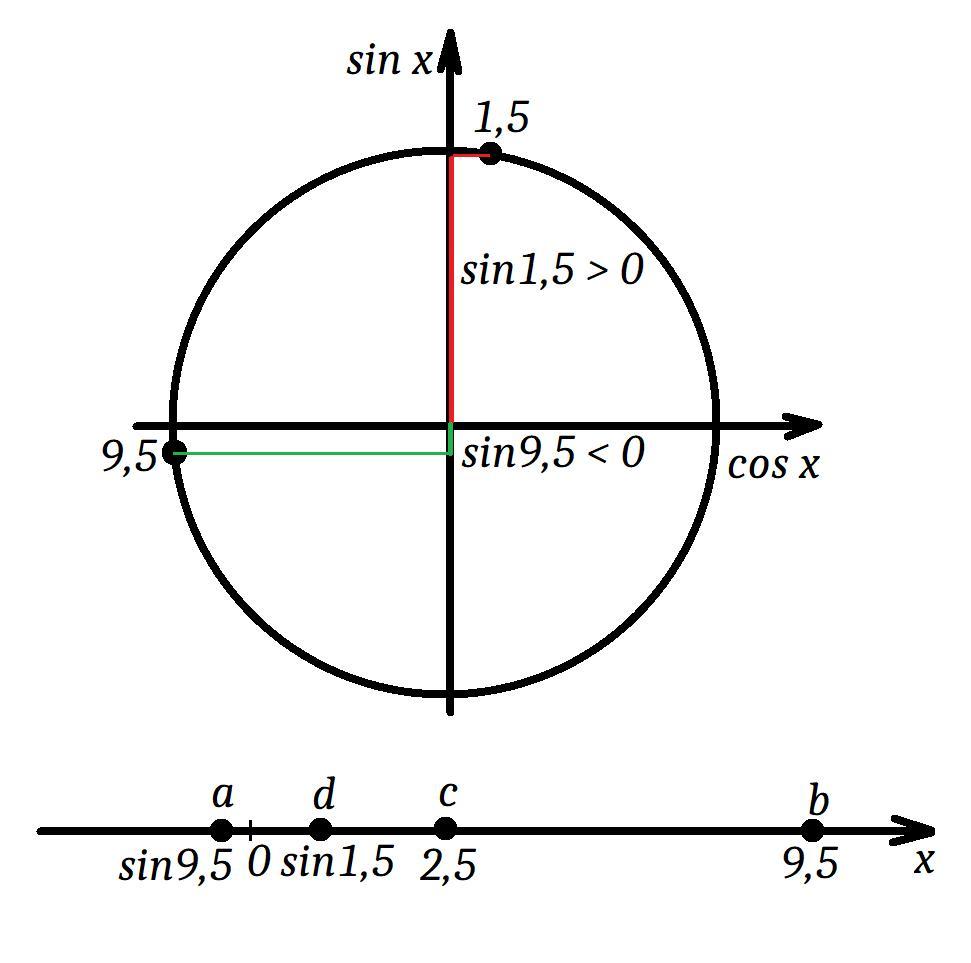 Множества значений синуса: [-1;1], поэтому наибольшим число будет b=9,5 далее будет c=2,5.