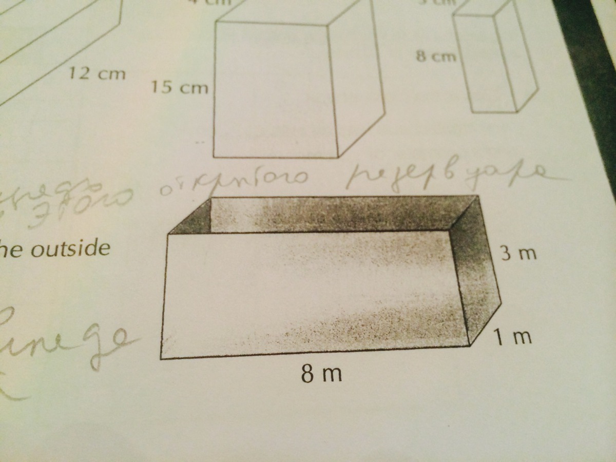 Найти площадь поверхности этого резервуара,прямоугольного параллелепипеда без верха: