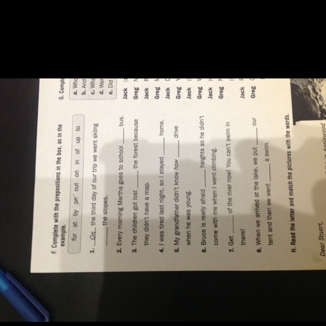 F) 1.(второй предлог) on 2. By 3.in 4.At 5.to 6.Of 7.out 8.1)up 2)for