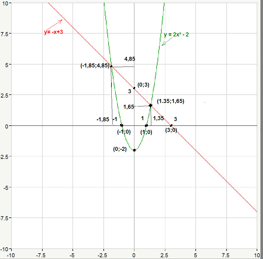 точки пересечение графиков функций у= -х+3 и у=2х^2 - 2: