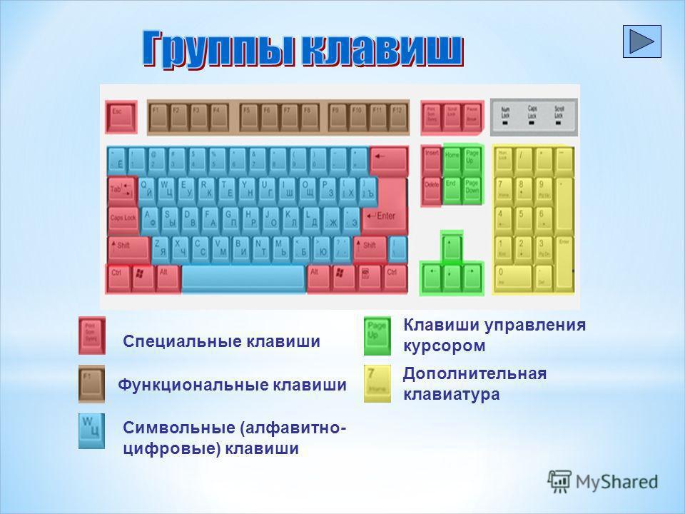 2) символьные (алфавитно-цифровые) клавиши — синим;