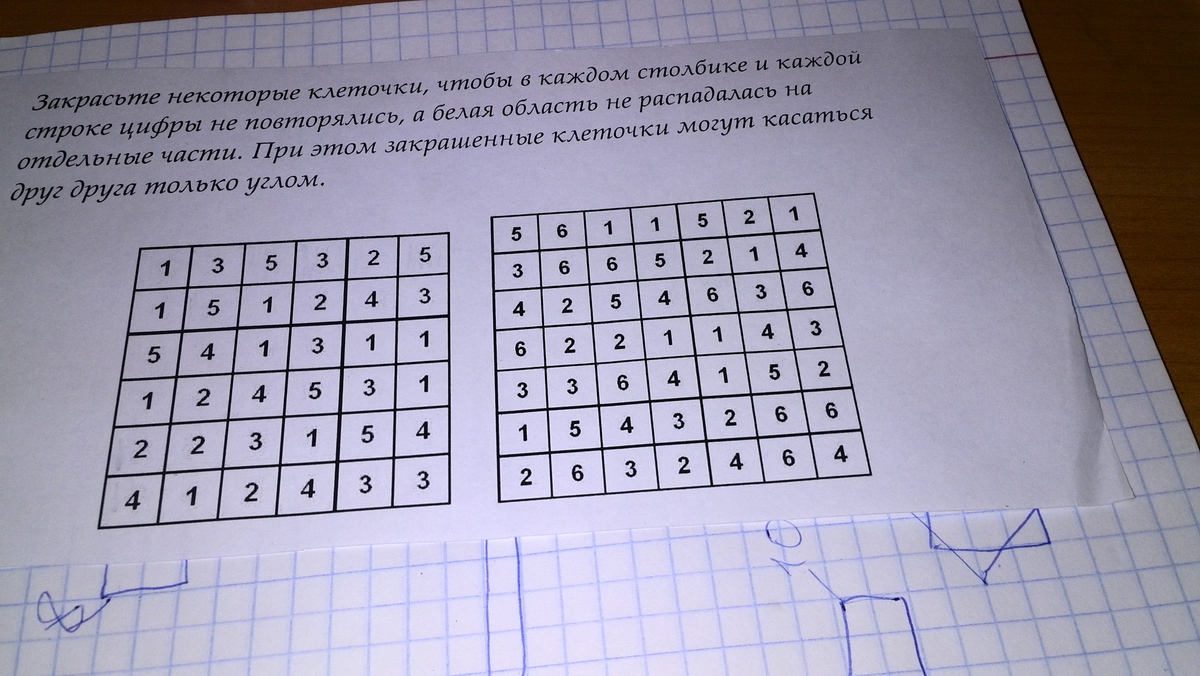 Закрасьте некоторые клеточки, чтобы в каждом столбике и каждой строке цифры не повторялись, а белая область не распадалась на отдельные части. При этом закрашенные клеточки могут касаться друг друга только углом.