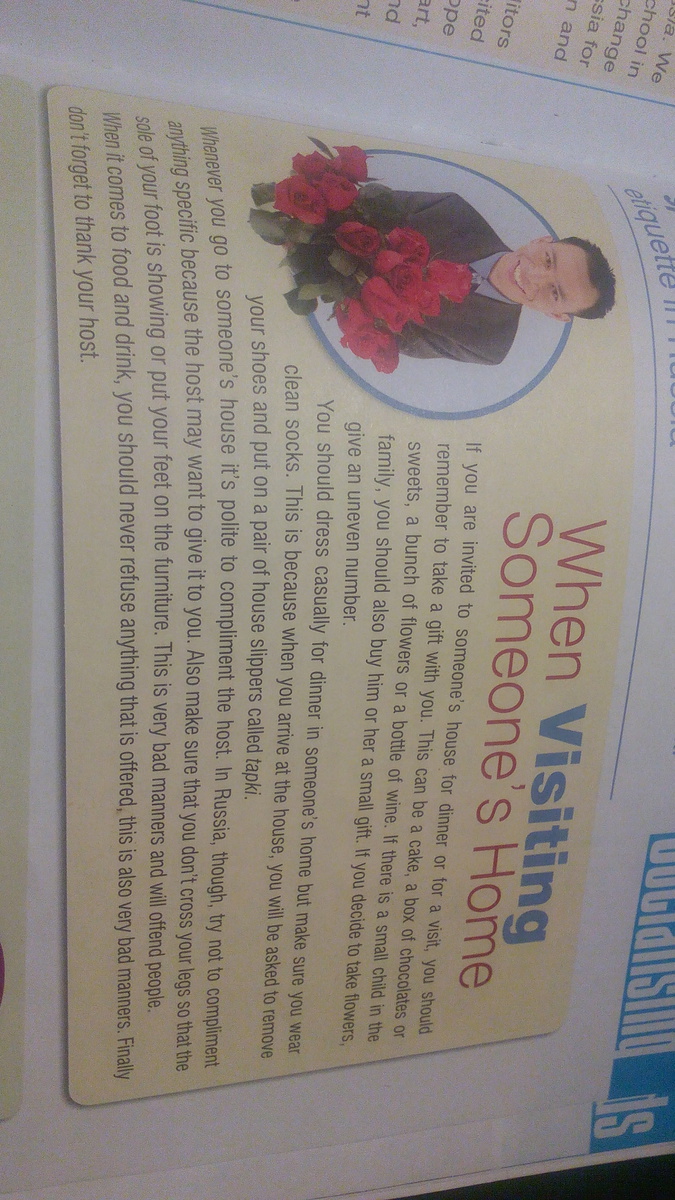 Если вы приглашены на чужой дом на ужин или в гости, вы должны помнить, чтобы принять подарок с вами. Это может быть торт, коробка конфет или сладостей, букет цветов или бутылку вина. Если есть маленький ребенок в семье, вы должны также купить его или ее небольшой подарок. Если вы решили взять цветы, дают нечетное число. Вы должны одеваться небрежно на ужин в гостях. Когда вы приедете в доме, вам будет предложено снять обувь и надеть пару домашних тапочек называемых тапки. Везде, где вы идете в чужой дом это вежливо, чтобы хвалить хозяина. В России, тем не менее, постарайтесь не хвалить ничего конкретного, потому что хозяин можете дать его вам. Также убедитесь, что вы не скрестите ноги так, чтобы нога ваша, показывает или положить ноги на мебели. Это очень плохие манеры и оскорблять людей. Когда дело доходит до еды и питья, вы никогда не должны отказываться все, что предлагается, это тоже очень плохие манеры. Наконец, не забудьте поблагодарить вашего хозяина.