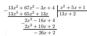 Найдите остаток от деления многочлена f(x)= 13x^3+67x^2-3x+4 на многочлен p(x)=x^2+5x+1