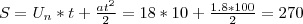 получаем путь по формуле (1+2+3....+t)*a+v1*t=55*1,8+180=279