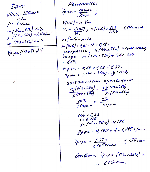 определите объём раствора сульфата натрия,массовая доля которого равна 12%,и плотность 1,11 г/мл,который надо долить в стакан чтобы получить раствор с массовой долей Na2SO4 2%.