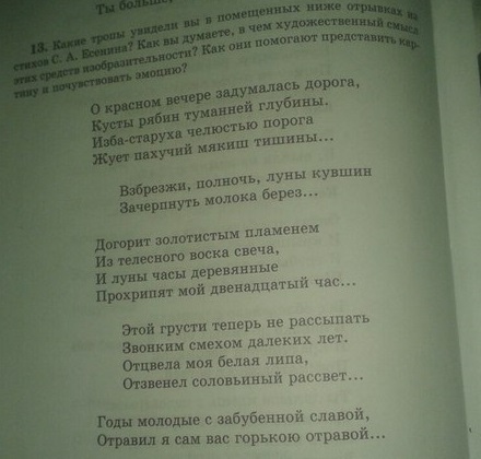 Какие тропы увидели вы в помещенных ниже отрывках из стихов С.А.Есенина ? Как вы думаете , в чем художественный смысл этих средств изобразительности ? Как они помогают представить картину и почувствовать эмоцию ?