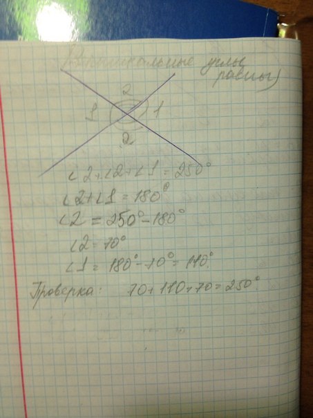 Так как при пересечении двух прямых образуется две пары вертикальных, а вертикальные углы равны между собой, то есть еще один угол 110° среди трёх, сумма которых 250°