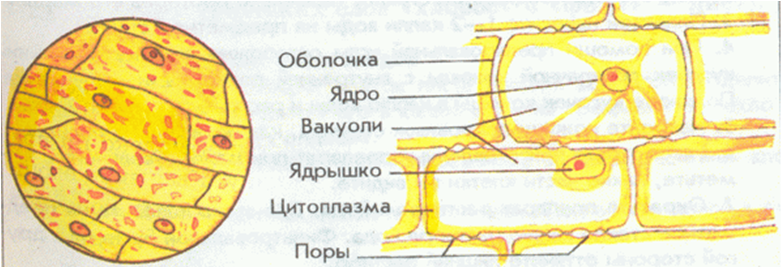 клетка кожицы лука состоит их целлюлозной оболочки. Внутри клетки находится вязкая цитоплазма. Вакуоли с клеточным соком. В цитоплазме располагается ядро с ядрышком- эти части можно заметить по световым микроскопом.