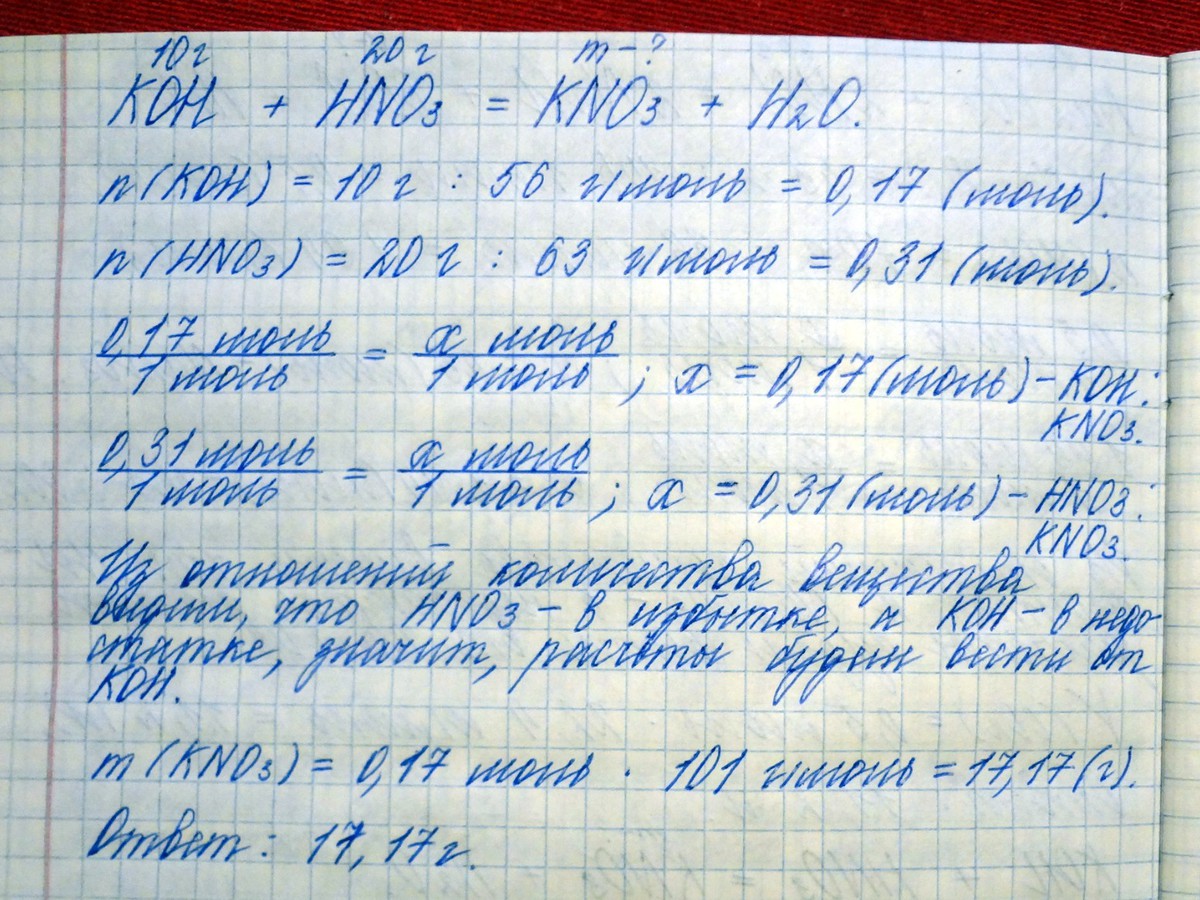 Сколько соли образуется (в граммах) при взаимодействии 10 грамм гидроксида калия с 20 грамм азотной кислоты?Срочно.