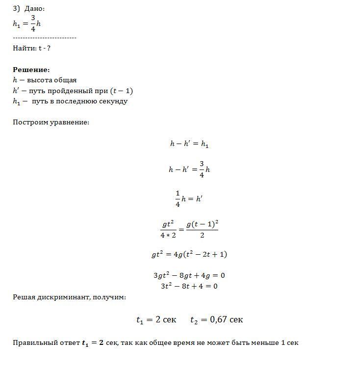 3) В течение какого времени падало тело,если в последнюю секунду падения оно прошло 3/4 всего пути? Начальная скорость тела равна нулю.