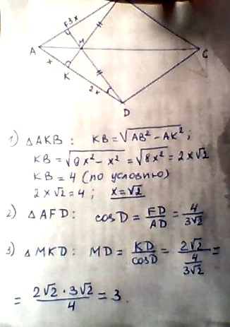 BK - перпендикуляр к стороне AD ромба ABCD , BK пересекает диагональ AC в точке M. Найти MD, если BK=4, AK : KD=1:2.