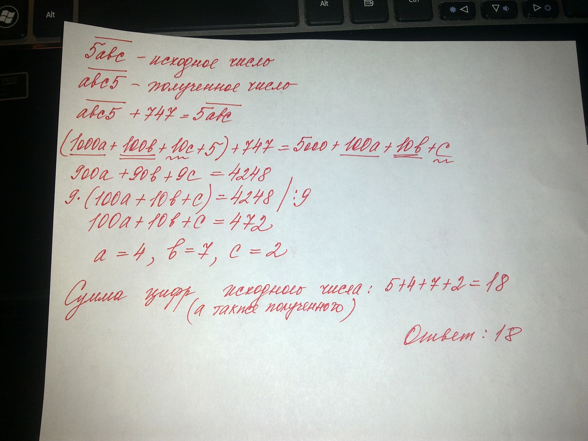 Четырёхзначное число начинается с цифры 5. Эту цифру переставили в конец числа. Полученное число оказалось на 747 меньше исходного. Какова сумма цифр этого числа?