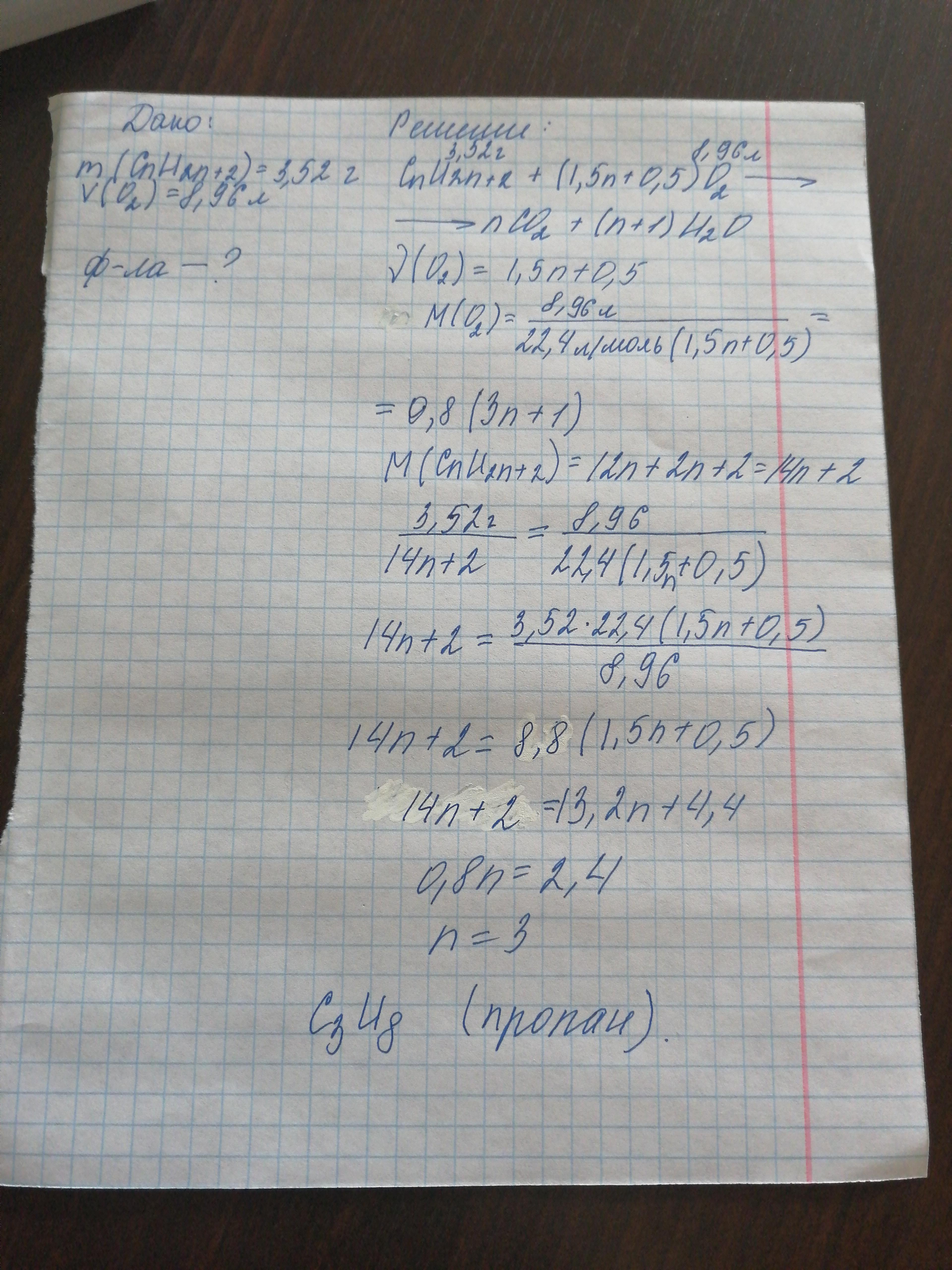 для сжигания алкана массой 3.52г необходим кислород занимающий при н.у. 8.96л. Определите молекулярную формулу алкана