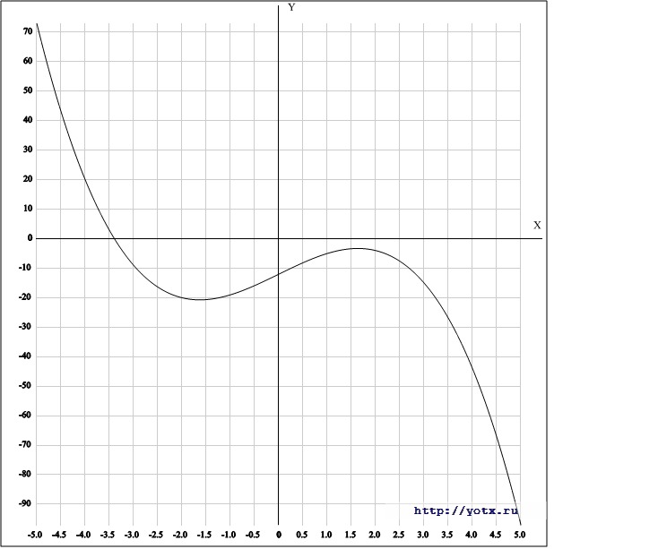 Результат: y=-12. Точка: (0, -12)Точки пересечения графика функции с осью координат X:График функции пересекает ось X при y=0, значит нам надо решить уравнение:-x^3+8*x-12 = 0 Решаем это уравнение и его корни будут точками пересечения с X: