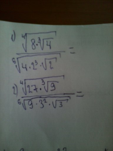 1) Числитель: нужно 8 загнать под корень 3-й степени. Будет корень 4-й степени под этим корнем ещё корень 3-й степени, а под этим корнем результат выражаем в виде степени с основанием 2. 2^9*2^2, т.е. в числителе стоит корень 12-й степени, а под корнем 2^11.