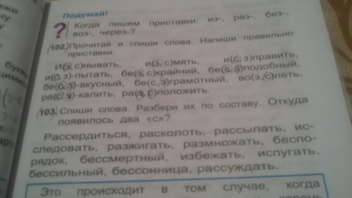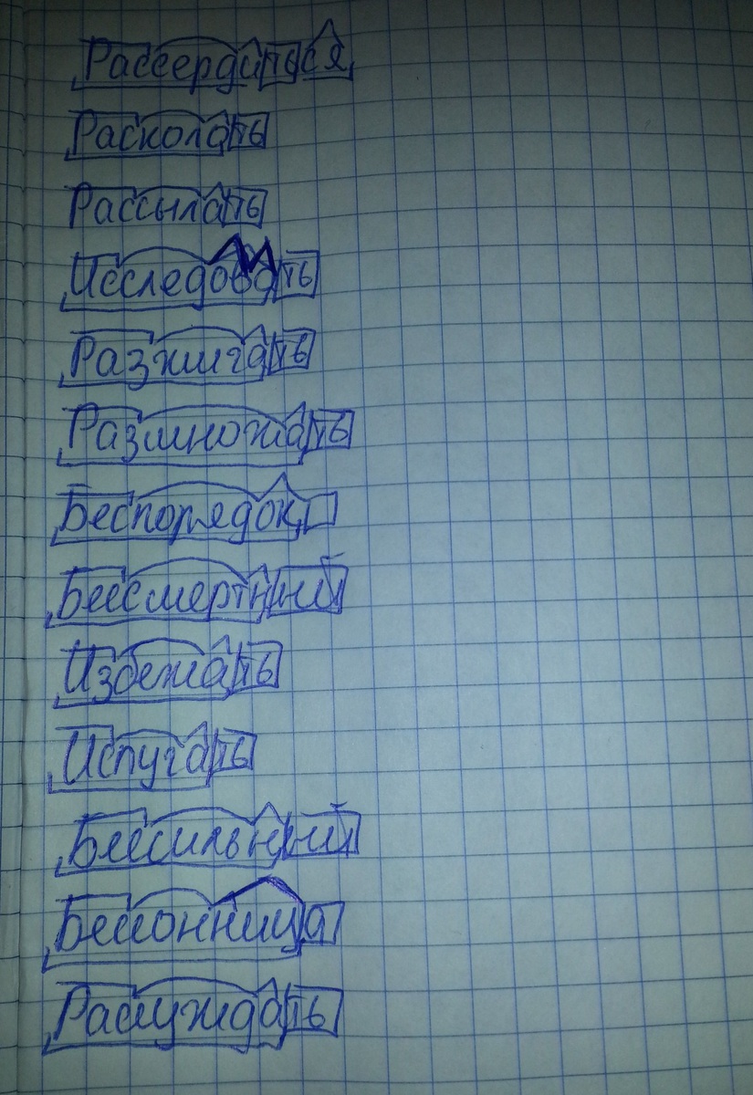 103.Рассердиться(рас- приставка,серд-корень,ить-окончание,рассерди(окончание не подчеркивай)ся),расколоть(рас-приставка,кол-корень,оть-окончание,раскол-основа),рассылать(рас-приставка,сыл-корень,ать-окончание,рассыл-основа),исследовать(ис-приставка,след-корень,в-суффикс,ать-окончание,исследов-основа),разжигать(раз-приставка,жиг-корень,ать-окончание,разжиг-основа),размножать(раз-приставка,множ-корень,ать-окончание,размнож-основа),беспорядок(бес-приставка,порядок-корень,беспорядок-основа,окончание- нулевое),бессмертный(бес-приставка,смерт-корень,н-суффикс,ый-окончание,бессмертн-основа),избежать(из-приставка,беж-корень,ать-окончание,избеж-основа),испугать(ис-приставка,пуг-корень,ать-окончание,испуг-основа),бессильный(бес-приставка,силь-корень,н-суффикс,ый-окончание,бессильн-основа)бессонница бес приставка,сон-корень,ниц-суффикс,а-окончание,бесснонниц-основа),рассуждать(рас-приставка,суж-корень,д-суффикс,ать-окончание,рассужд-основа).Очень легко.