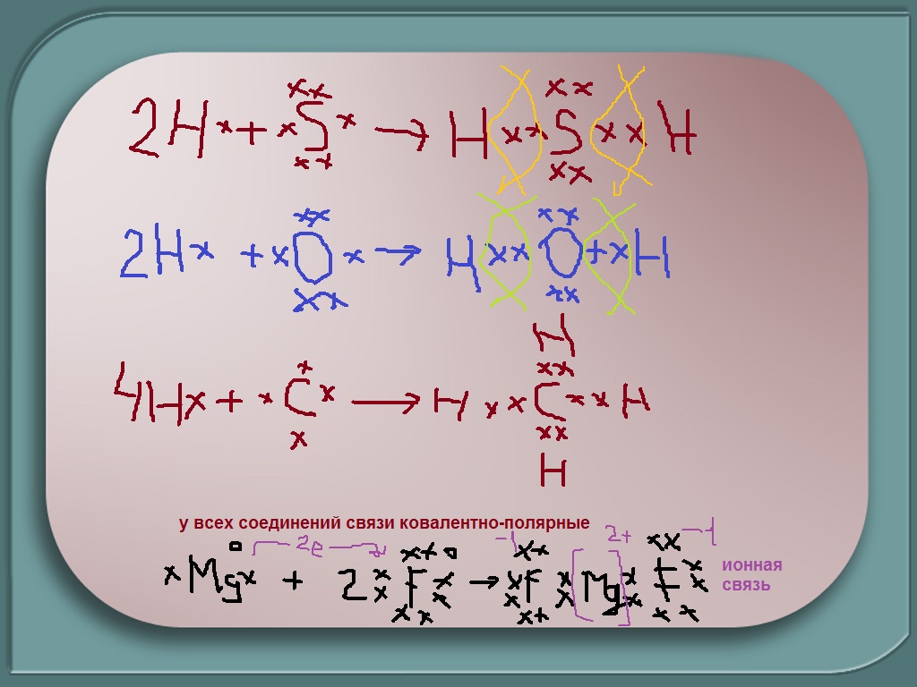 ковалентно-полярная связь у них образуется за счет обобществления электронных пар и сдвига электронное плотность к атому с большей ЭО.
