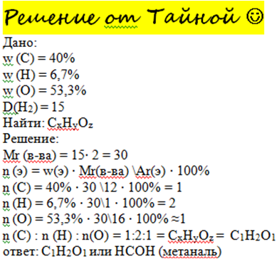 Имеется органическое вещество, в котором массовая доля углерода равна 40%, водорода — 6,7%, кислорода— 53,3%. Относительная плотность этого вещества по водороду равна 15. Выведите молекулярную формулу вещества.