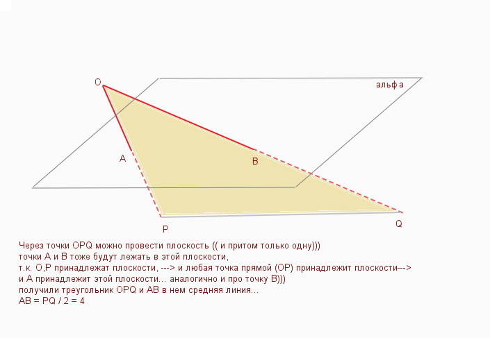 Плоскость альфа проходит через две точки A и B, являющиеся серединами отрезков OP и OQ соответственно. Найдите AB, если PQ = 8 см..