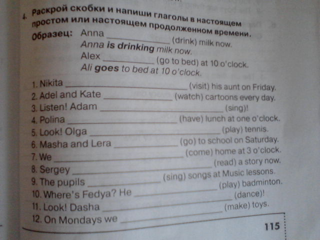 «раскрой скобки и напиши глаголы настоящем простом или настоящем продолженном времени»
