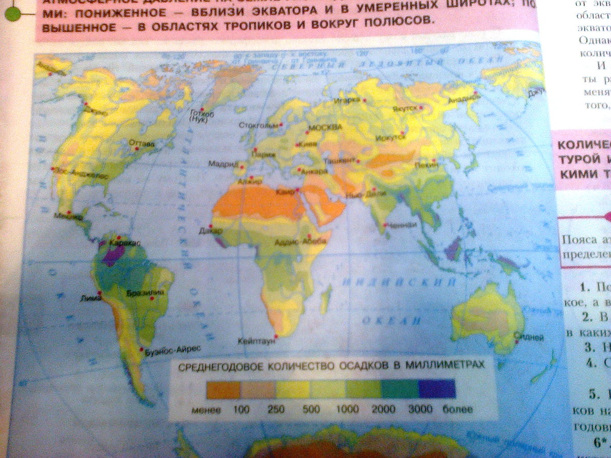 2) Вопрос. определите территории на которых в год выпадает осадком: менее 100мм., от 500 до 1000мм., 2000мм. и более