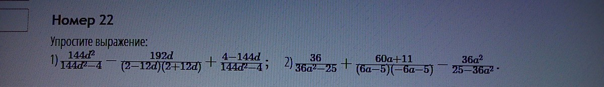 это дроби с одинаковым знаменателем :12d^2 - 2^2 -Этот знаменатель Вы видите в конце в ответе,а в числителе приведите подобные члены 144d^2 +4-(-192х-144х =то,что в ответе в числителе!