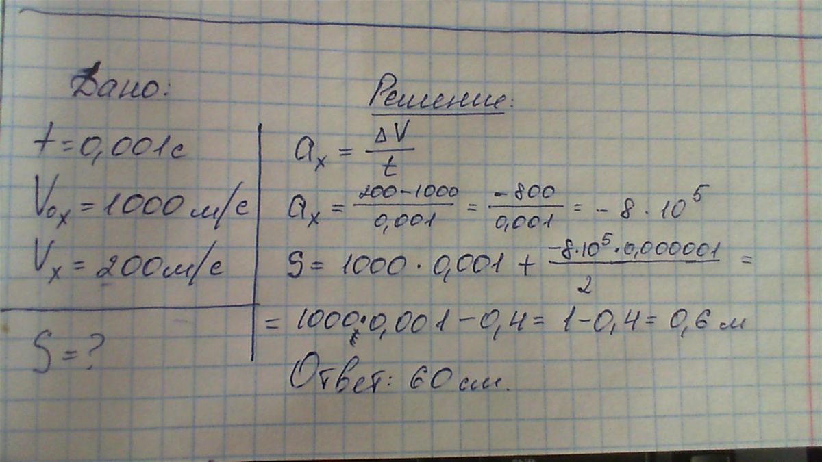 Снаряд, летящий со скоростью 1000 м/с, пробивает стенку блиндажа за 0,001 с и после этого его скорость оказывается 200 м/с. Считая движение снаряда в толще стенки равноускоренным, найдите ее толщину.