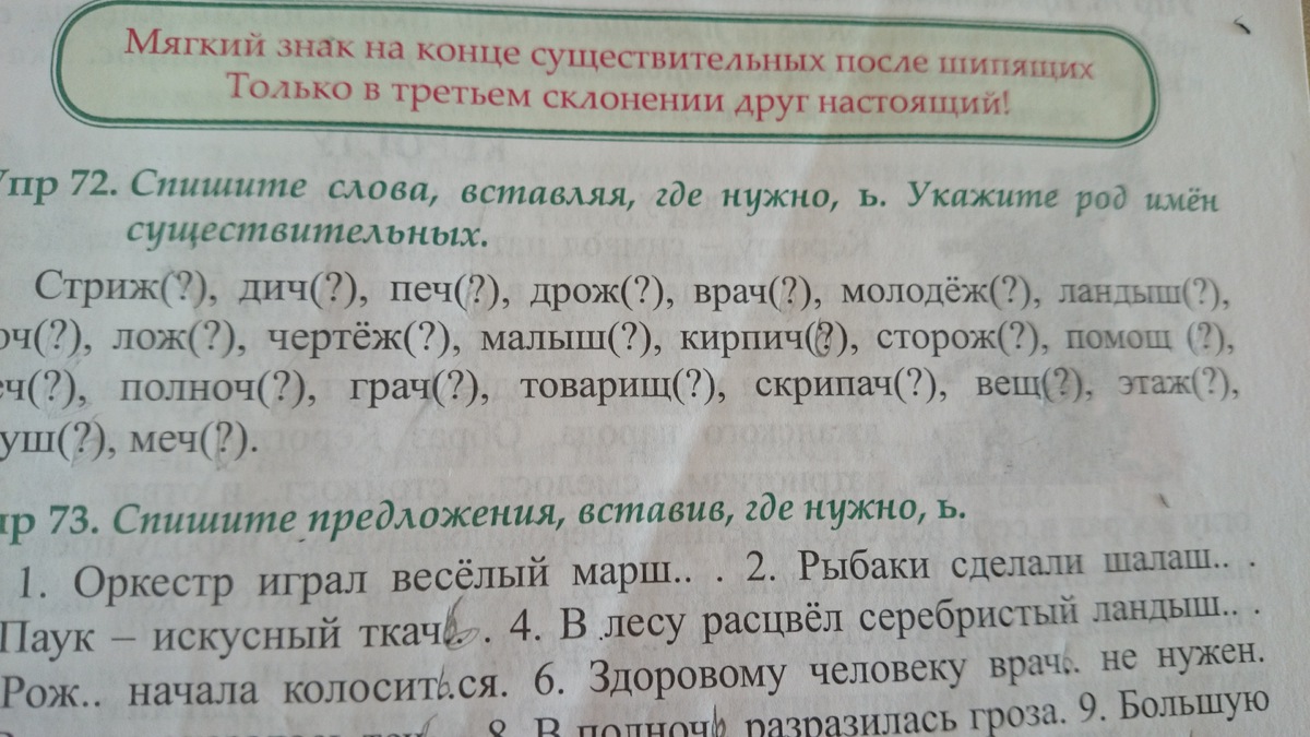 Стриж,дичь,печь,дрожь,врач,молодежь,ландыш,ложь,чертеж,малыш,кирпич,сторож,помощь,полночь,грач,товарищ,скрипач,вещь,этаж,меч.