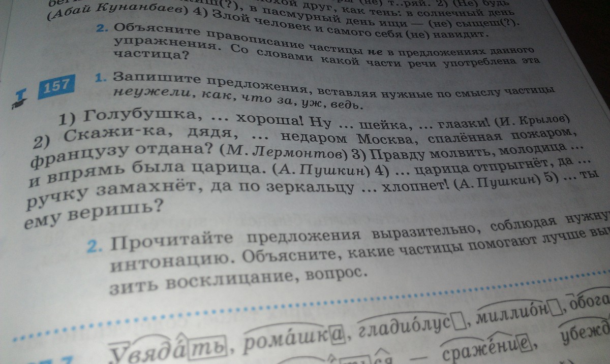 1)голубушка КАК хороша! Ну ЧТО ЗА шейка, ЧТО ЗА глазки! 2) Скажи-ка, дядя, ВЕДЬ недаром Москва, спалённая пожаром французу отдана? 3) Правду молвить, молодица УЖ и впрямь была царица. 4) КАК царица отпрыгнёт, да КАК ручку замахнёт, да по зеркальцу КАК хлопнет! 5)НЕУЖЕЛИ ты ему веришь?