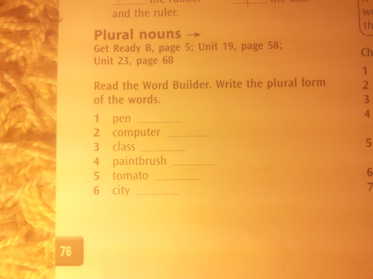 1)pen - pens, computer - computers, class - classes, paintbrush - paintbrushes, tomato - tomatoes, city - cities