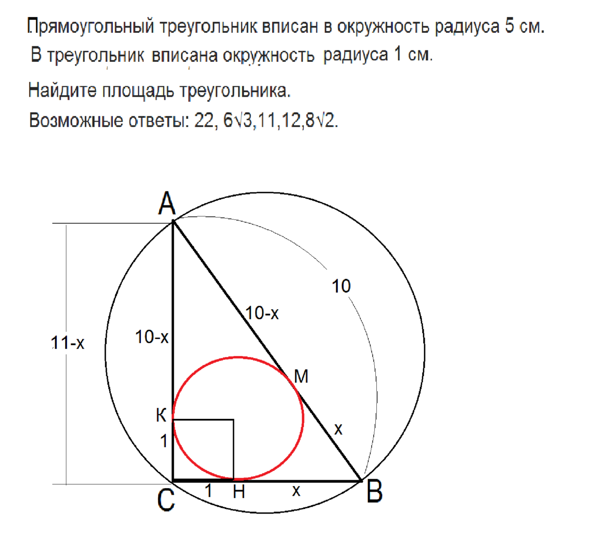 прямоугольный треугольник вписан в окружность радиуса 5 см. В треугольнике вписана окружность радиуса 1 см. Найдите площадь треугольника. Возможные ответы: 22, 6√3,11,12,8√2.