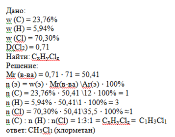 Плотность хлорпроизводного алкана по хлору равна 0,71. Содержание в этом соединении углерода – 23,76%, водорода – 5,94%, хлора – 70,30%. Определите формулу вещества