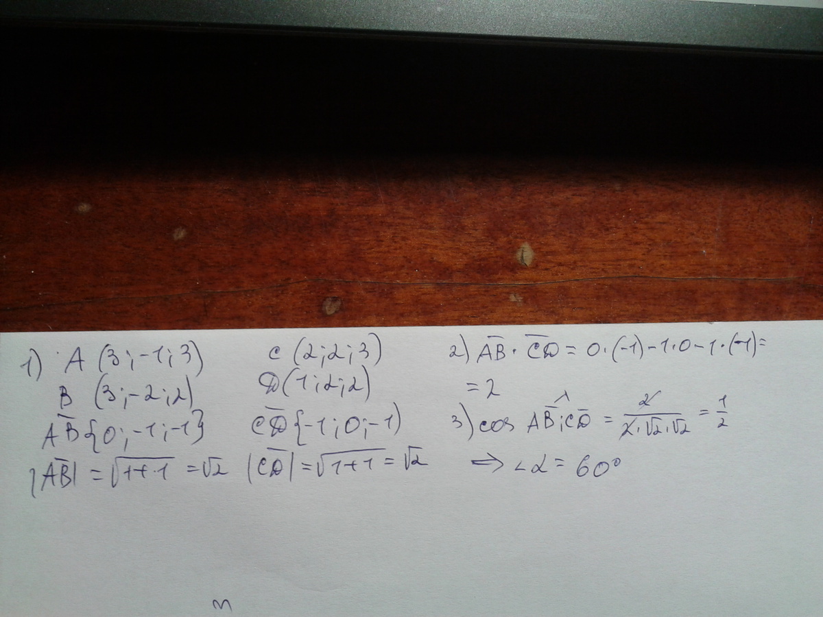 1)по координатам точек найдём координаты ,а далее длины векторов; 2)найдём скалярные произведения векторов; 3)cosα=скалярное произведение разделим на удвоенное произведение длин векторов.