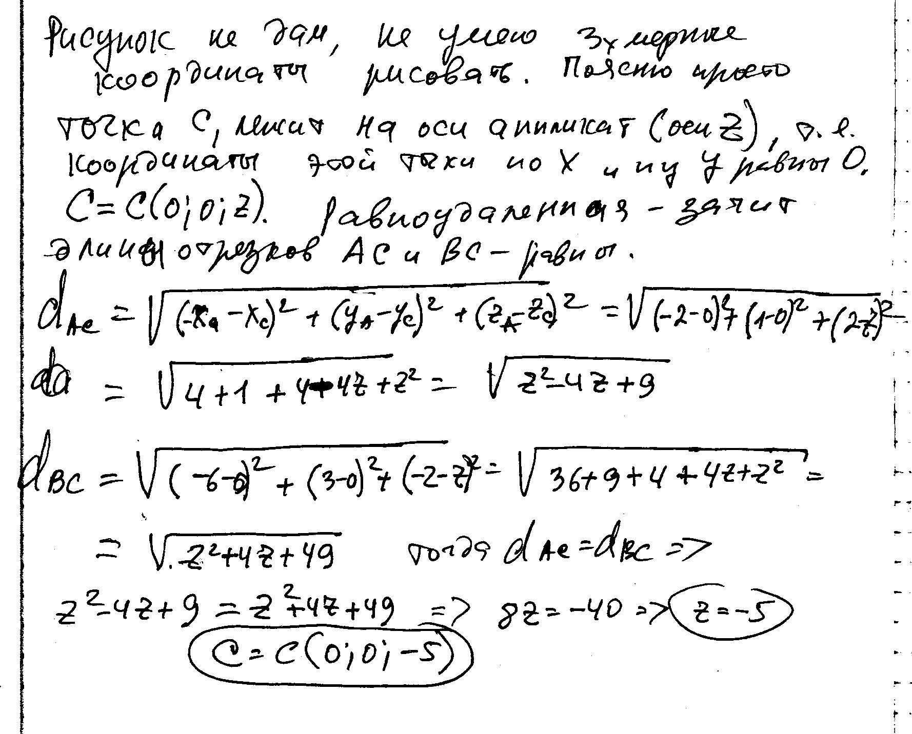 Даны точки А(-2; 1; 2), В(-6; 3; -2) на оси аппликат. Найти точку С, равноудалённую от точек А и В.