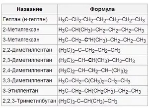 Гептан имеет 9 изомеров, их структурные формулы и номенклатура: