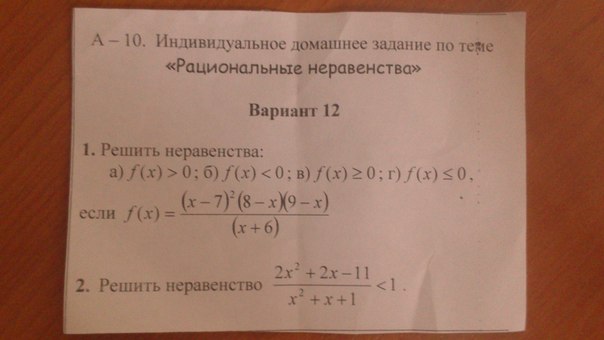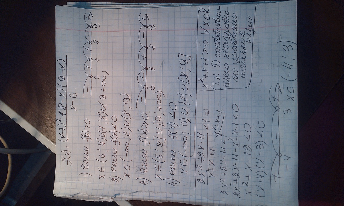 a) f(x)>0; б) f(x)<0; в) f(x)≥0; г) f(x)≤0, если f(x)=(x-7)²(8-x)(9-x)/(x=6).