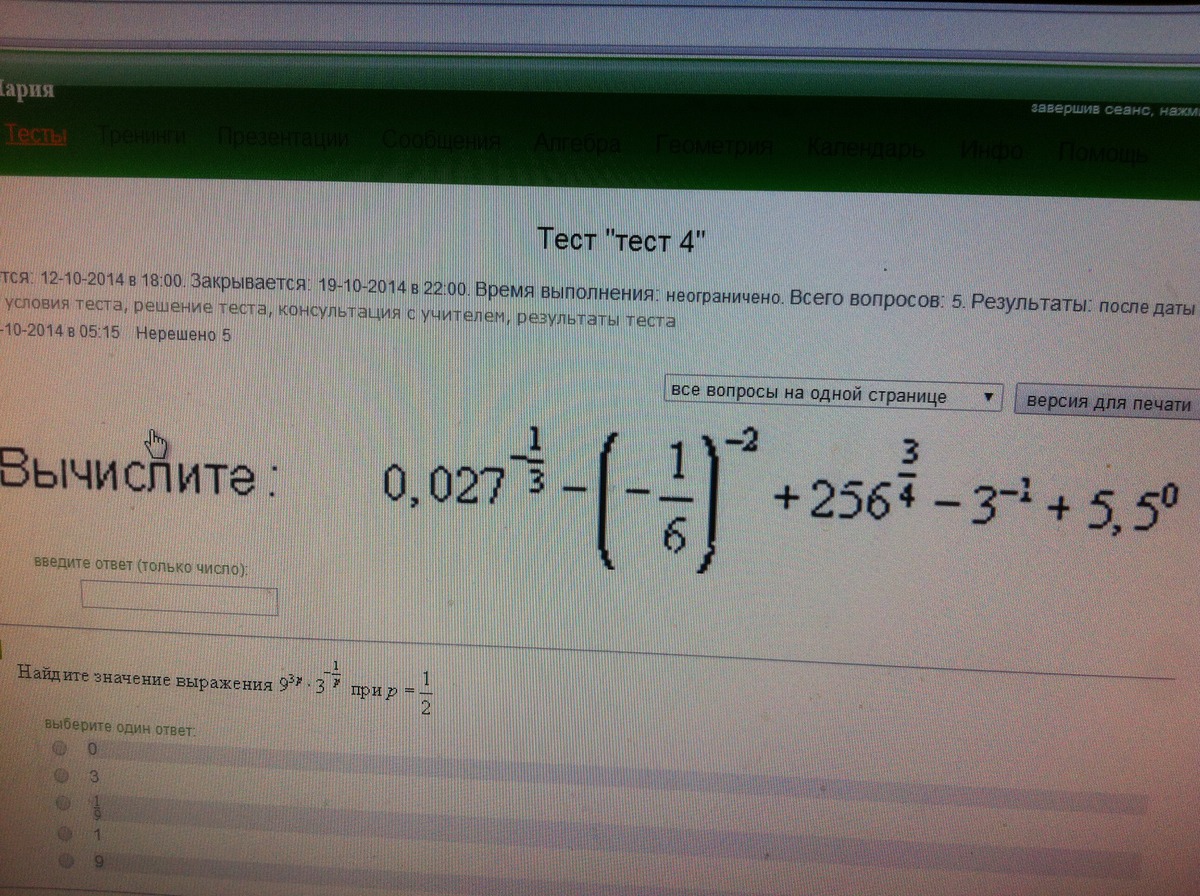 0,027⁻¹/³ -(-1/6)⁻²+256³/⁴-3⁻¹+5,5°=(0,3³)⁻¹/³ -(-6/1)²+(4⁴)³/⁴-1/3+1=