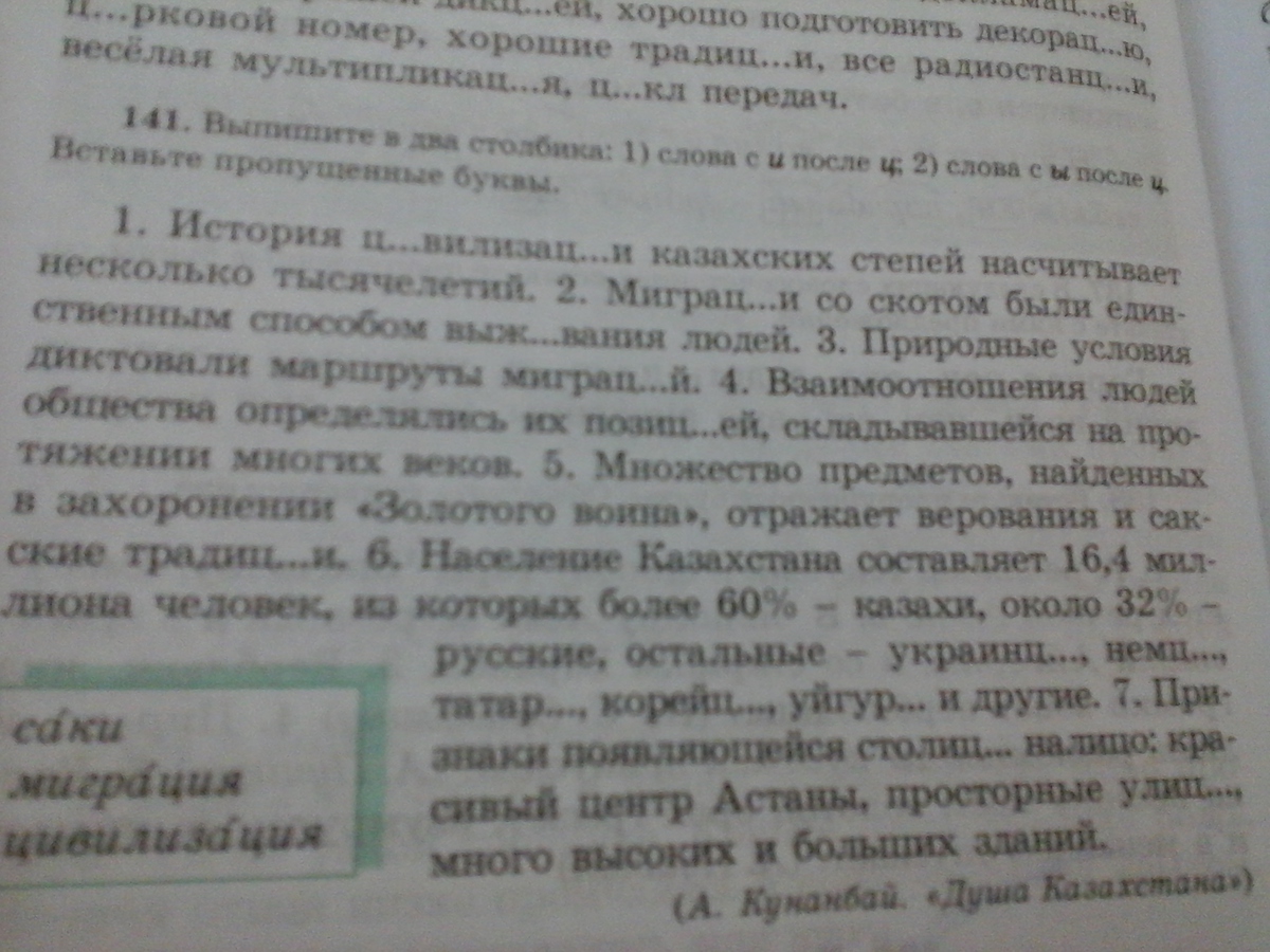 Слова с "и": цИвилизацИи, миграцИей, позицИей, традицИи. Слова с "ы":украинцЫ, немцЫ, корейцЫ, столицЫ, улицЫ. Пропущ. буквы:выжИвания, татарЫ, уйгурЫ. Надеюсь, помогла:))